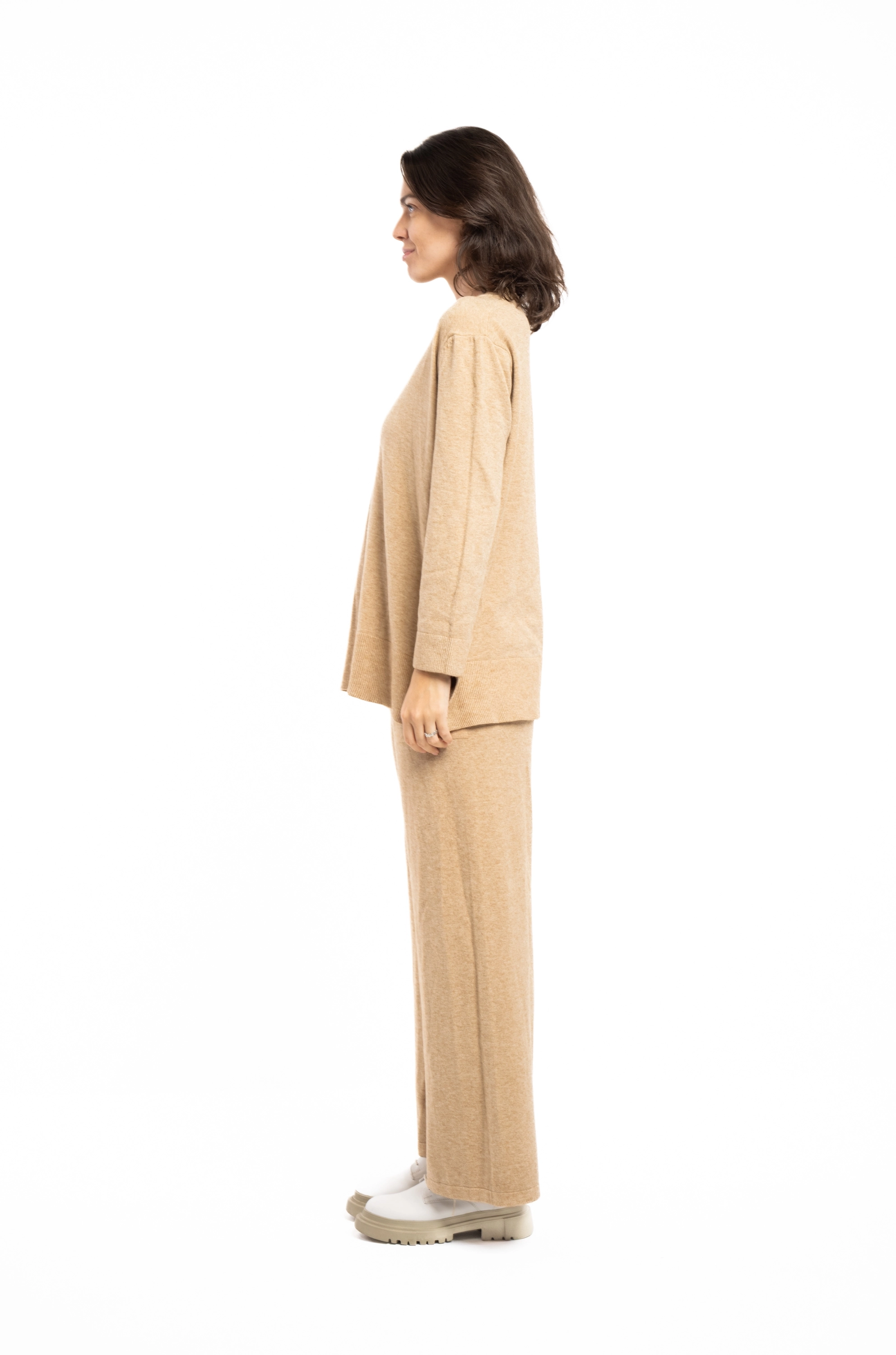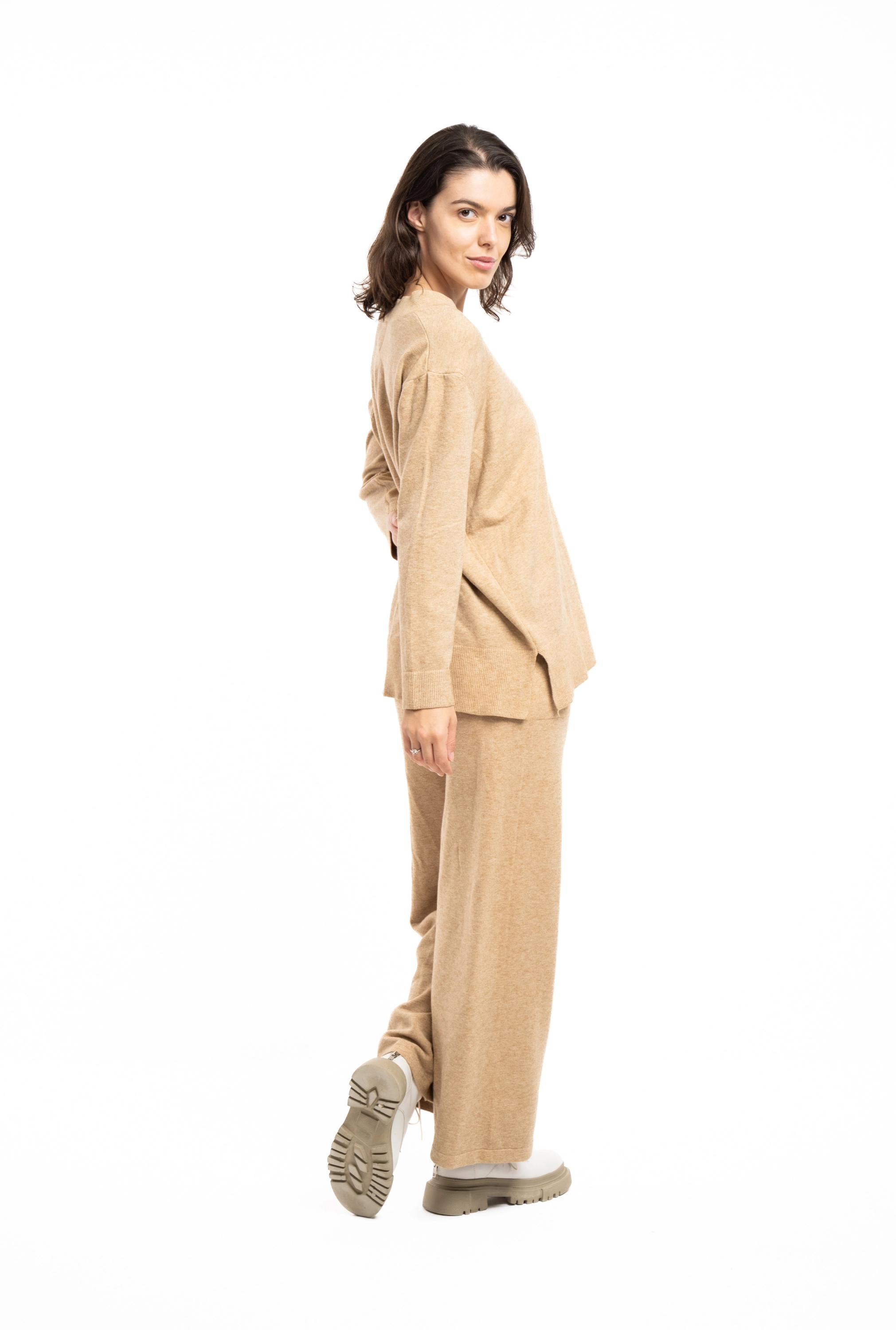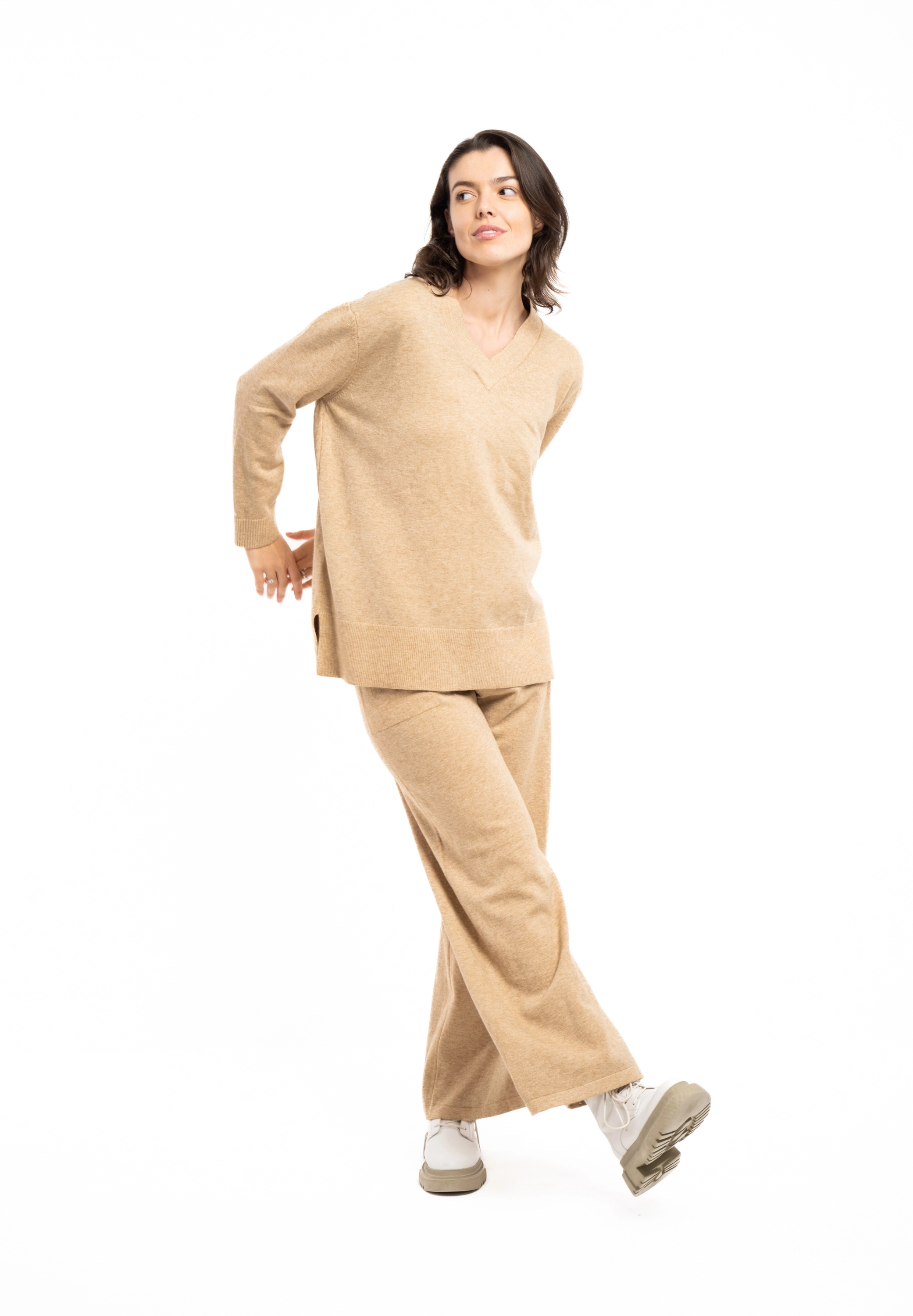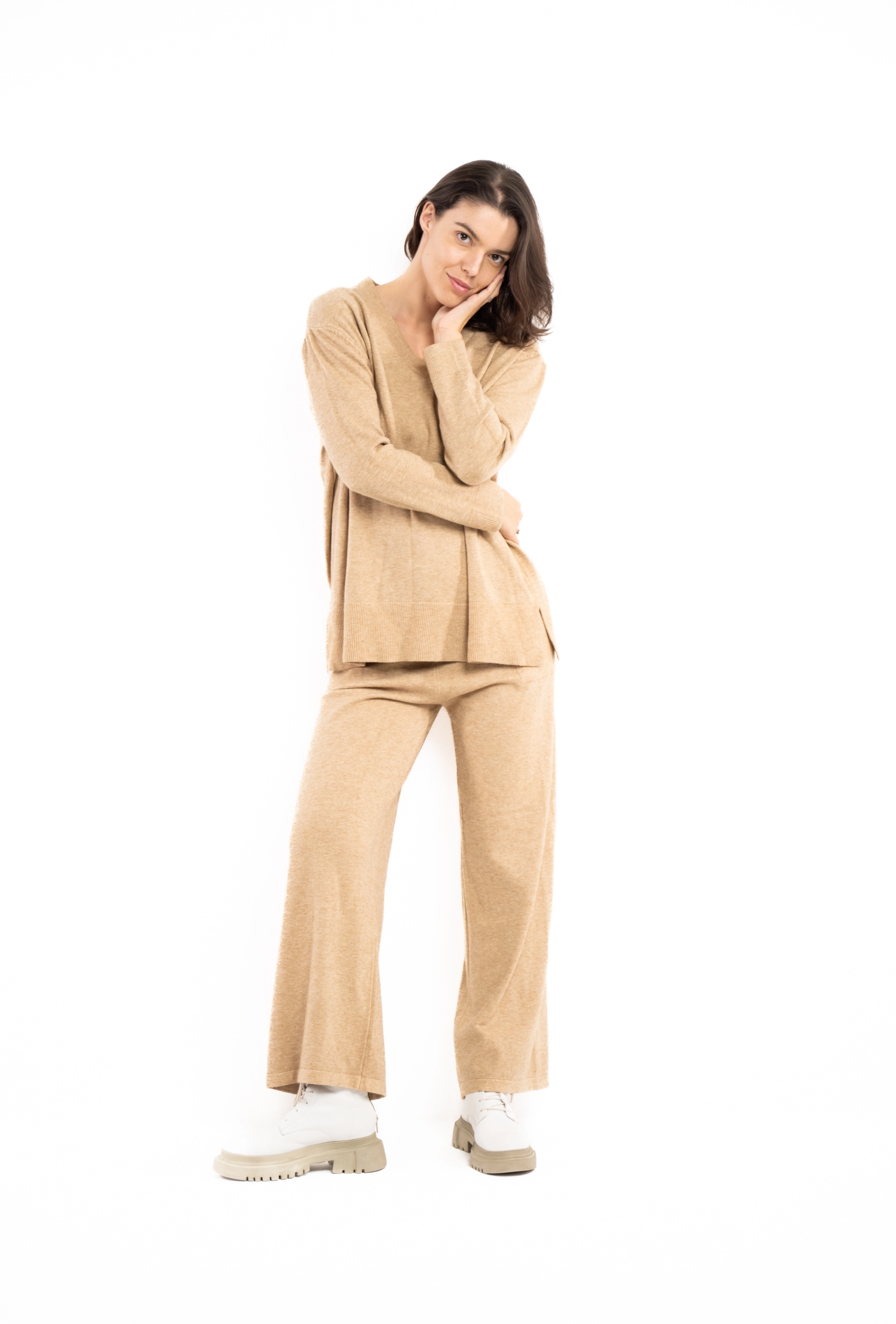 Descriere: Compleu din tricot classy, cu decolteu in v
