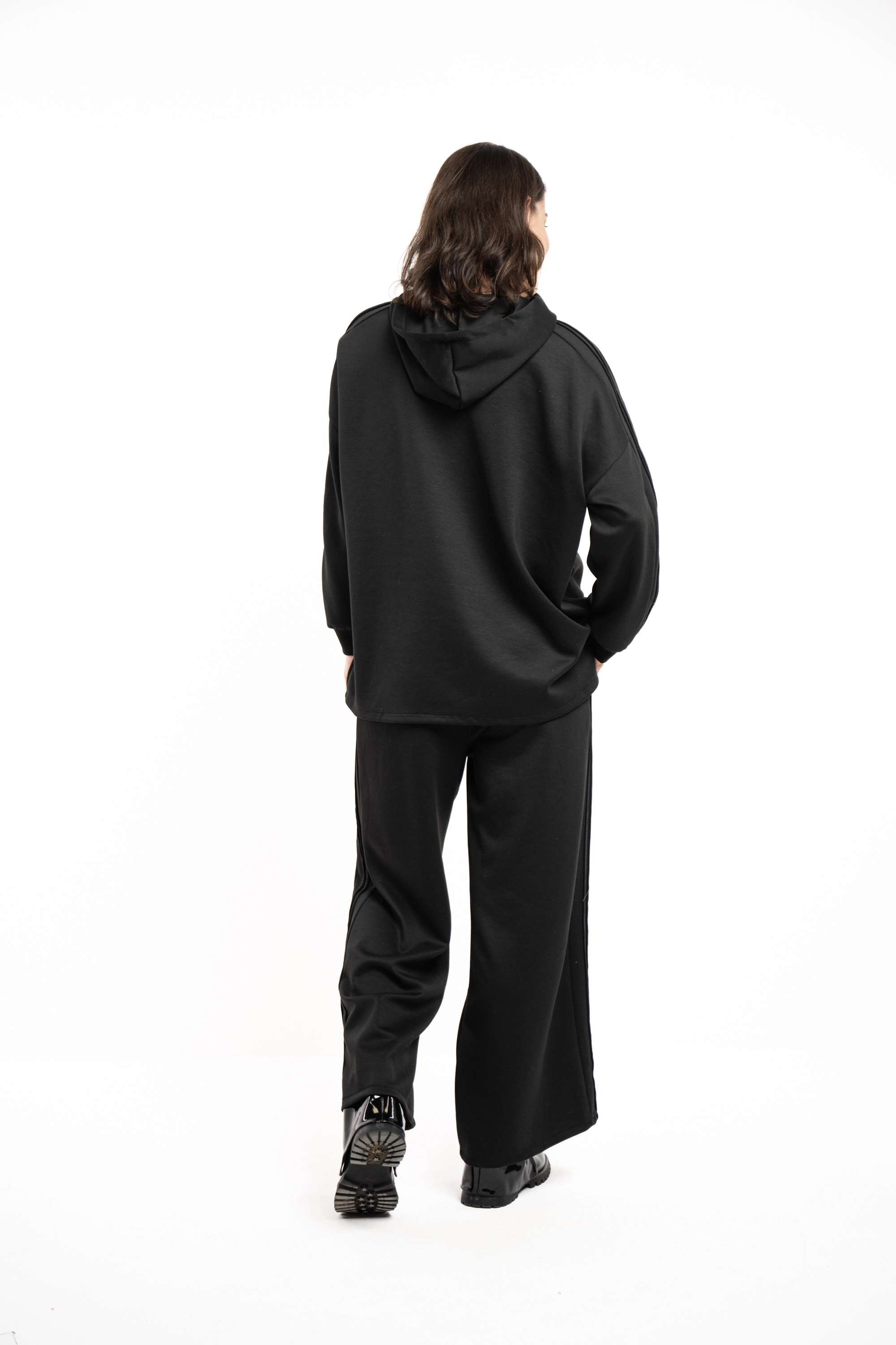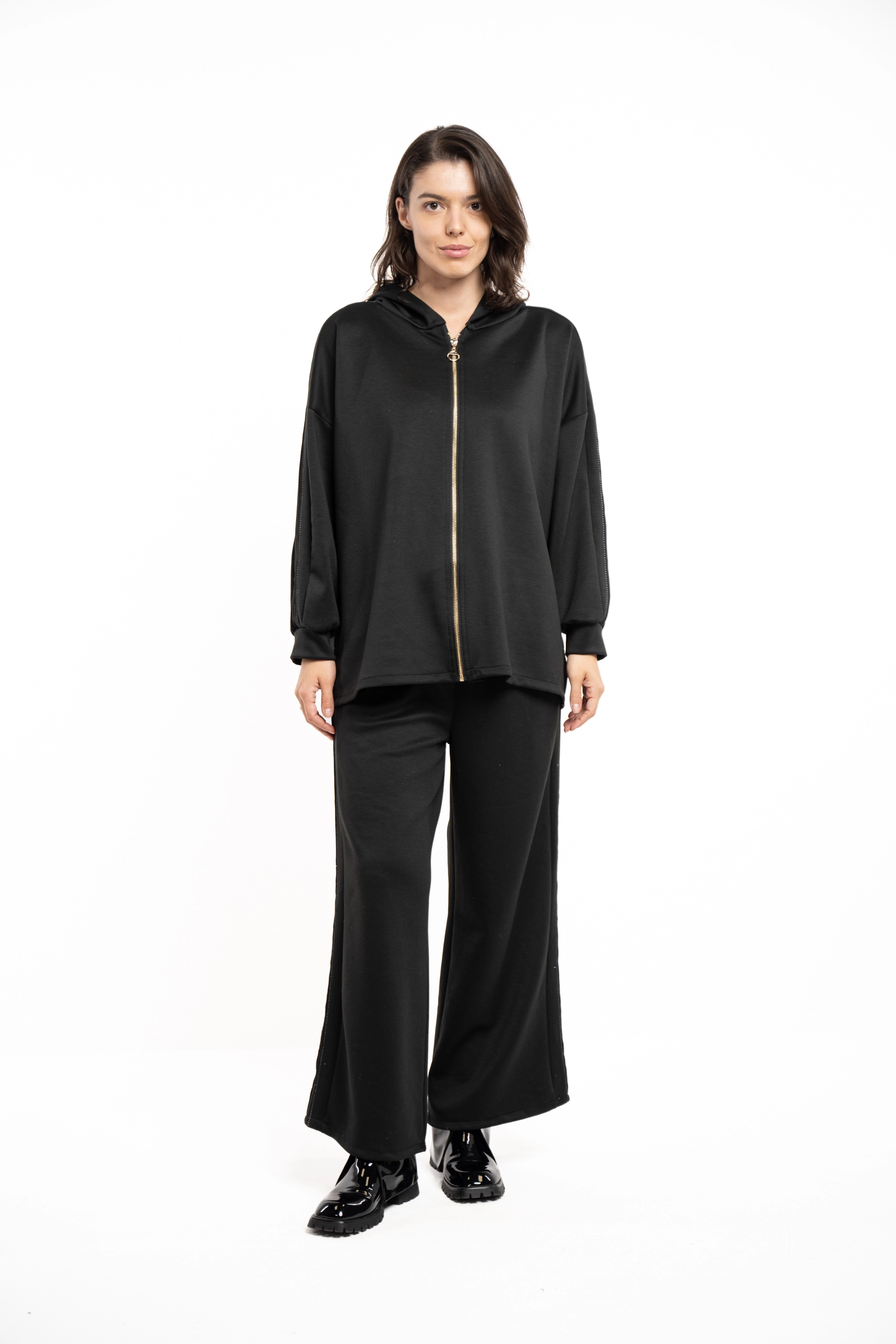 Descriere: Compleu comfy, din material moale, cu hanorac cu gluga