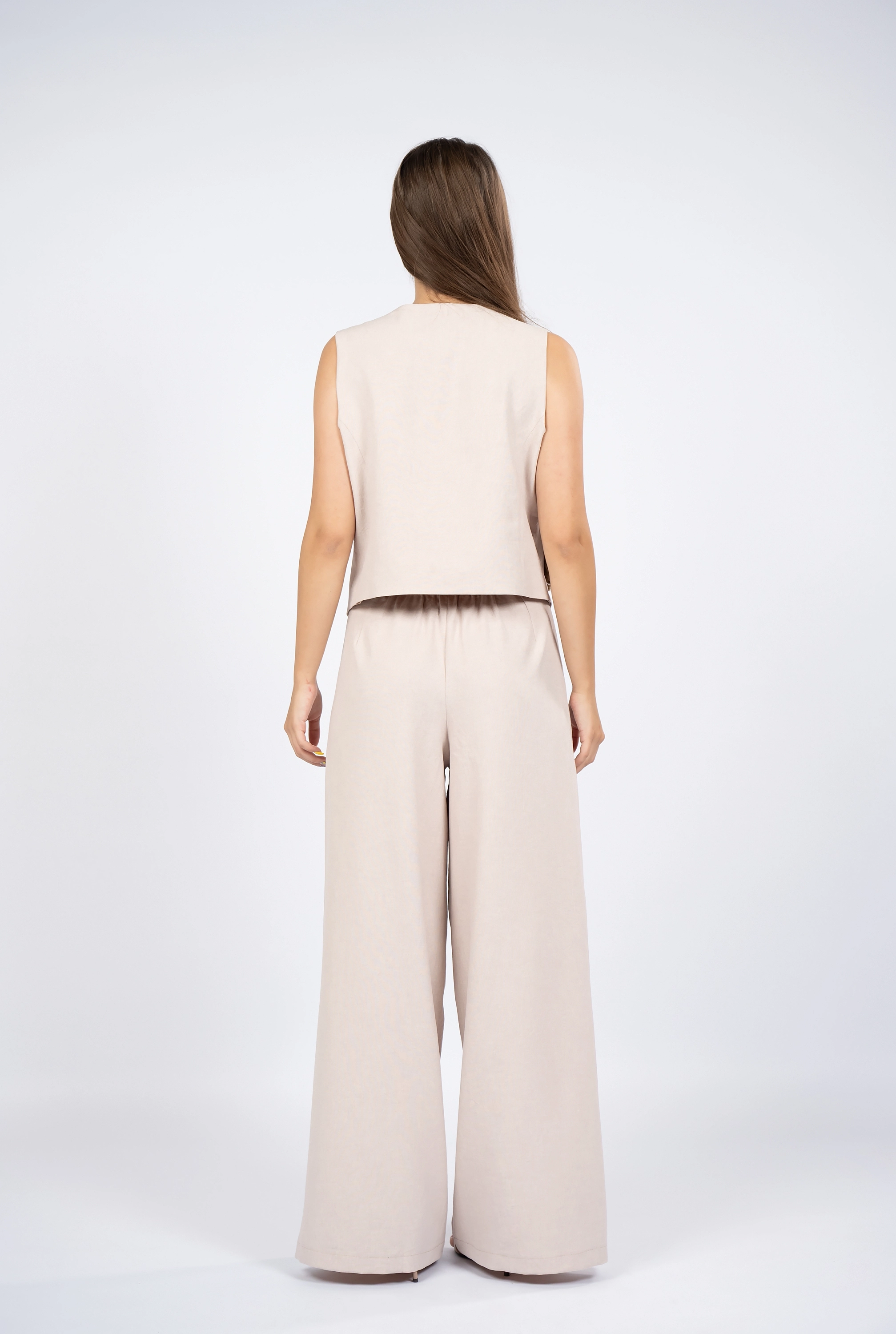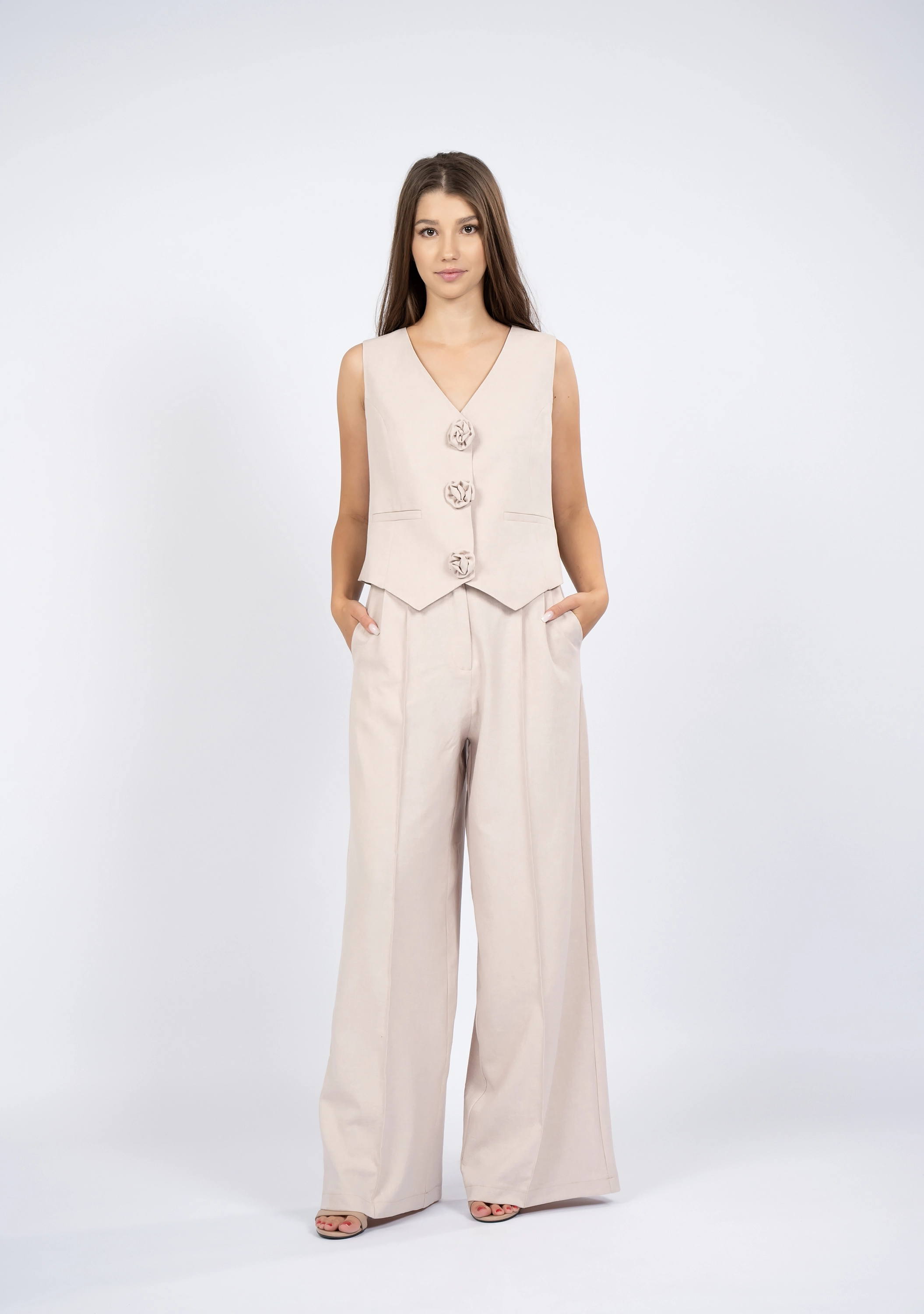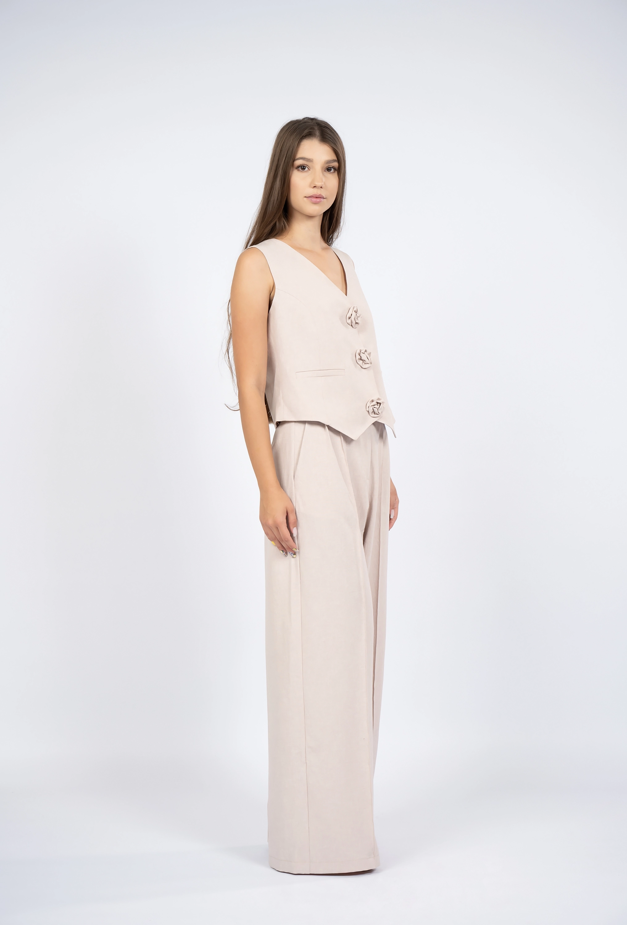 Descriere: Compleu office chic cu pantalon evazat si vesta cu nasturi trandafir.