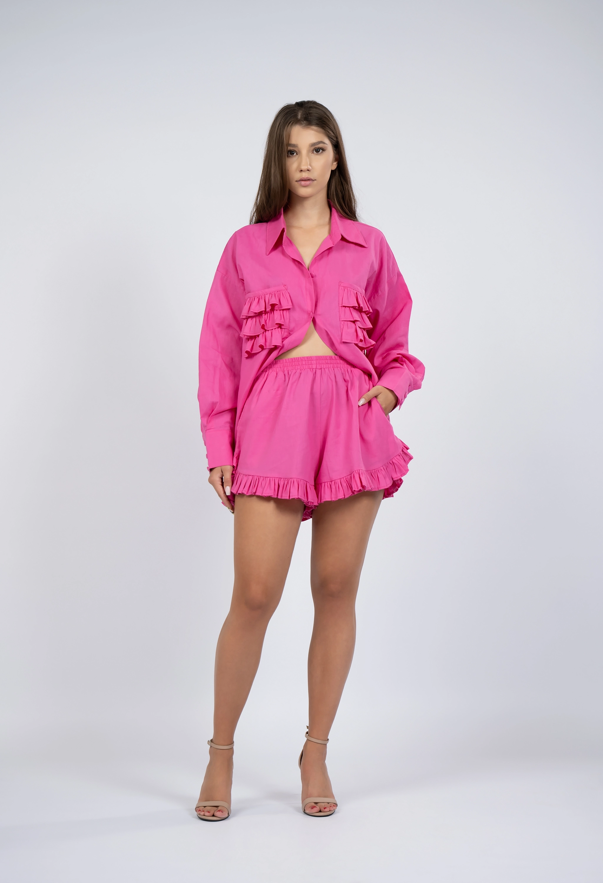 Descriere: Set comfy, format dintr-o camasa regular fit, cu volane aplicate pe buzunare si pantaloni scurti.